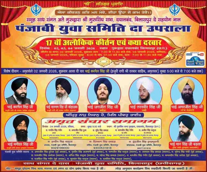बिलासपुर। CG NEWS : प्रतिवर्ष अनुसार इस वर्ष भी पंजाबी युवा समिति बिलासपुर द्वारा श्री गुरुद्वारा सिंग सभा दयालबंद व समूह साध संगत के सहयोग से तीन दिवसीय अलौकिक कीर्तन दरबार एवं अमृत संचार समागम का आयोजन 2 जनवरी, 3 जनवरी और 4 जनवरी को किया जा रहा है।