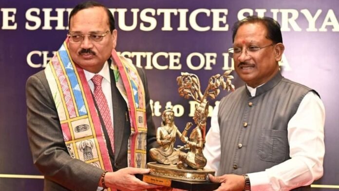 रायपुर। CG NEWS: भारत के मुख्य न्यायाधीश न्यायमूर्ति सूर्यकांत के छत्तीसगढ़ आगमन पर राजधानी रायपुर में गरिमामय वातावरण में उनका आत्मीय स्वागत किया गया। मुख्यमंत्री विष्णु देव साय ने पुष्प गुच्छ भेंटकर मुख्य न्यायाधीश का अभिनंदन किया और उन्हें प्रदेश की समृद्ध सांस्कृतिक परंपरा से जुड़ी स्मृति चिह्न भेंट किए।