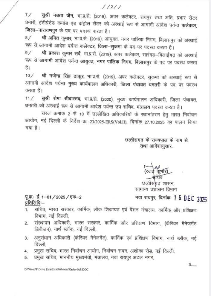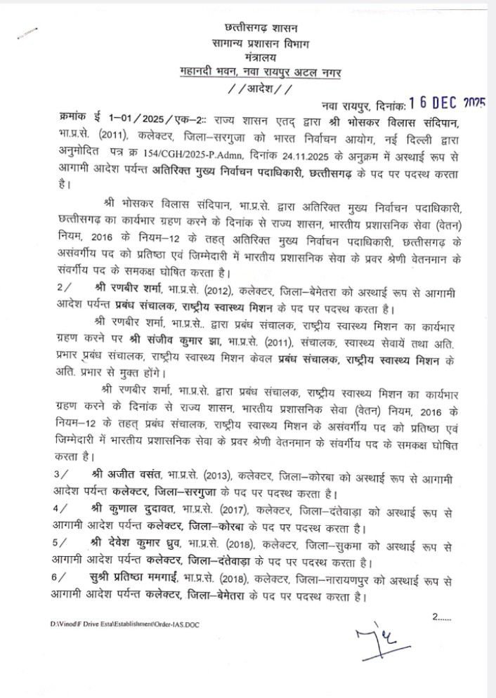 HomeChhattisgarhछत्तीसगढ़ शासन के सामान्य प्रशासन में कार्यभार परिवर्तन ChhattisgarhDevelopmentTransferUdta Teer Specialछत्तीसगढ़राजनीति छत्तीसगढ़ शासन के सामान्य प्रशासन में कार्यभार परिवर्तन By Dr. Richa Sharma December 16, 2025 0 434 Share FacebookTwitterPinterestWhatsApp TagsChhattisgarhCMO ChhattisgarhIAS Transfer list Share FacebookTwitterPinterestWhatsApp Previous articleइस इलाके में मिली महिला की संदिग्ध लाशNext article9वीं के छात्र की संदिग्ध मौत से मचा हड़कंप Dr. Richa Sharma RELATED ARTICLES Chhattisgarh राइस उद्योग की समस्याओं को लेकर सांसद बृजमोहन के नेतृत्व में केंद्रीय खाद्य मंत्री प्रहलाद जोशी से मिले राइस मिलर्स December 16, 2025 Chhattisgarh वाइब्रेंट विलेजेज़ प्रोग्राम-I की समीक्षा में सांसद बृजमोहन अग्रवाल की निर्णायक पहल, दिसंबर 2025 तक सभी सीमावर्ती गांवों में 4G कनेक्टिविटी का लक्ष्य December 16, 2025 Chhattisgarh सौम्या चौरसिया को ED ने किया गिरफ्तार, कल कोर्ट December 16, 2025 LEAVE A REPLY Cancel reply Comment: Please enter your comment! Name:* Please enter your name here Email:* You have entered an incorrect email address! Please enter your email address here Website: Save my name, email, and website in this browser for the next time I comment. - Advertisment - Most Popular राइस उद्योग की समस्याओं को लेकर सांसद बृजमोहन के नेतृत्व में केंद्रीय खाद्य मंत्री प्रहलाद जोशी से मिले राइस मिलर्स December 16, 2025 वाइब्रेंट विलेजेज़ प्रोग्राम-I की समीक्षा में सांसद बृजमोहन अग्रवाल की निर्णायक पहल, दिसंबर 2025 तक सभी सीमावर्ती गांवों में 4G कनेक्टिविटी का लक्ष्य December 16, 2025 सौम्या चौरसिया को ED ने किया गिरफ्तार, कल कोर्ट December 16, 2025 25 हजार की रिश्वत लेते पकड़ाया तहसील का बाबू December 16, 2025 Load more Recent Comments WooCommerce on Protected: Order – November 27, 2023 @ 02:02 PM Radius Theme on Top 7 Best Car Racing Games for PC, PS4 and XBOX One in 2017 Radius Theme on Top 7 Best Car Racing Games for PC, PS4 and XBOX One in 2017 Radius Theme on Top 7 Best Car Racing Games for PC, PS4 and XBOX One in 2017 Radius Theme on Top 7 Best Car Racing Games for PC, PS4 and XBOX One in 2017