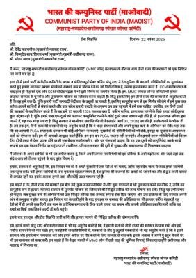 राजनांदगांव, 24 नवंबर। महाराष्ट्र-मध्यप्रदेश-छत्तीसगढ़ (एमएमसी) जोन के नक्सलियों ने तीनों राज्य के सरकार से पुलिस के सशस्त्र अभियान को तत्काल बंद करने तथा सरेंडर एवं अन्य विषयों पर विचार-विमर्श करने के लिए तीन माह का वक्त मांगा है।
