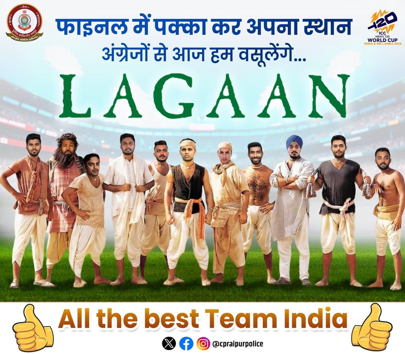 रायपुर पुलिस ने बॉलीवुड फिल्म लगान की तर्ज पर भारतीय क्रिकेट खिलाड़ियों का पोस्टर बनाकर सोशल मीडिया पर शेयर किया है। इस क्रिएटिव पोस्ट के साथ पुलिस ने एक दिलचस्प कैप्शन भी लिखा, जो लोगों को खूब पसंद आ रहा है।