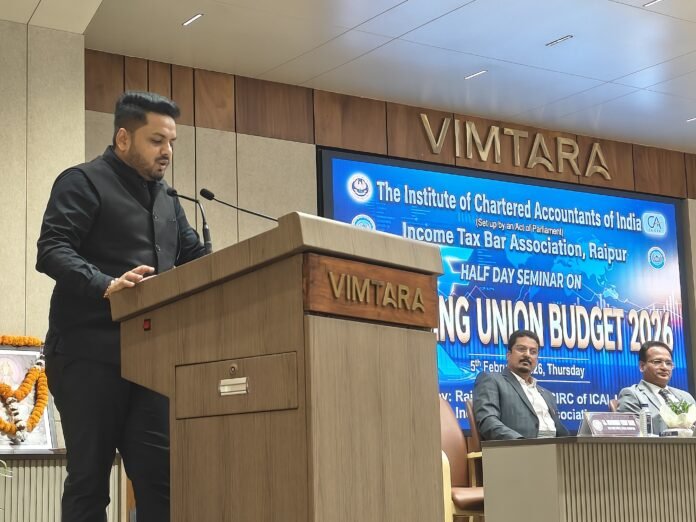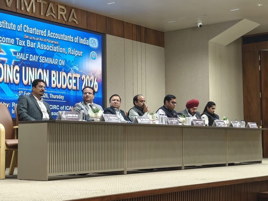 रायपुर, 5 फरवरी 2026। इनकम टैक्स बार एसोसिएशन, रायपुर एवं ICAI रायपुर शाखा के संयुक्त तत्वावधान में “डिसिफरिंग द यूनियन बजट 2026” विषय पर अर्द्धदिवसीय संगोष्ठी विमतारा भवन, शांति नगर में आयोजित की गई। कार्यक्रम में रायपुर एवं प्रदेश के विभिन्न जिलों से चार्टर्ड अकाउंटेंट्स, कर सलाहकार एवं अधिवक्ताओं ने सहभागिता की।