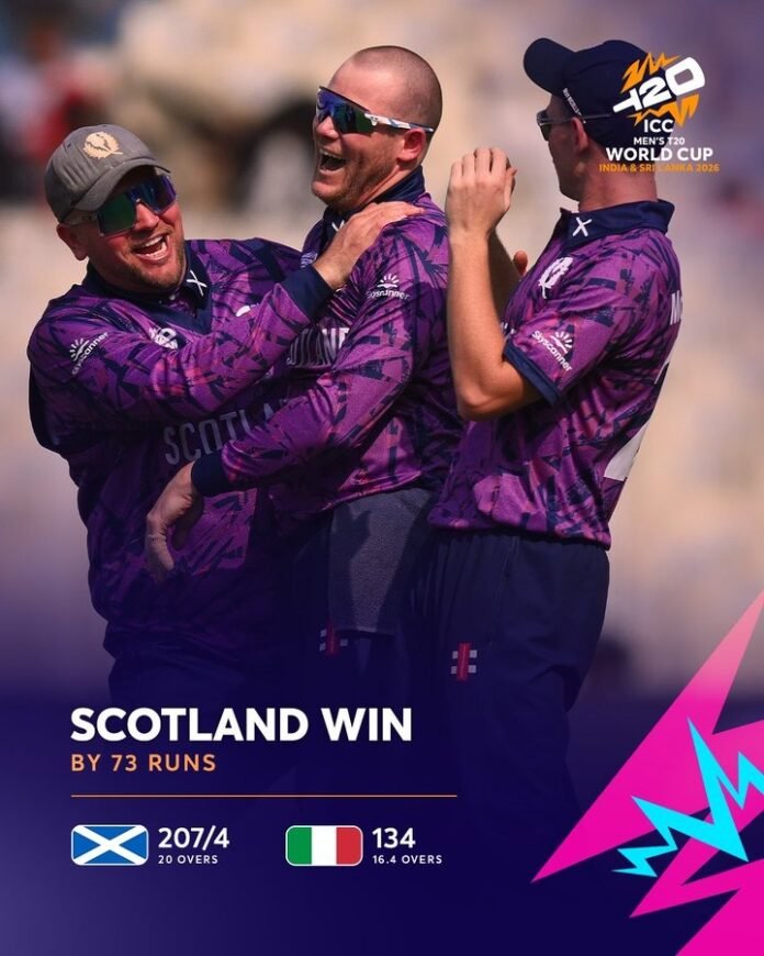 SCO vs ITA: ICC T20 वर्ल्ड कप 2026 में 9 फरवरी को स्कॉटलैंड और इटली के बीच कोलकाता के ऐतिहासिक ईडन गार्डन्स में खेले गए मुकाबले में इटली को हार का सामना करना पड़ा। इस मैच में टॉस जीतकर इटली की टीम ने पहले गेंदबाजी करने का फैसला किया। स्कॉटलैंड ने पहले बल्लेबाजी करते हुए 20 ओवर में 4 विकेट खोकर 207 रन बनाए। इसके जवाब में इटली की टीम 16.4 ओवरों में 134 रन पर ढेर हो गई।