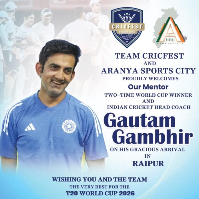 Gautam Gambhir : आगामी T20 वर्ल्ड कप 2026 से पूर्व भारतीय क्रिकेट टीम और भारतीय क्रिकेट टीम के मुख्य कोच, दो बार के विश्व कप विजेता गौतम गंभीर के रायपुर आगमन को लेकर राजधानी रायपुर में जबरदस्त उत्साह और क्रिकेटीय माहौल देखने को मिल रहा है। इस अवसर पर गौतम गंभीर के साथ-साथ पूरी भारतीय क्रिकेट टीम भी आकर्षण का केंद्र बनी हुई है। इसी कड़ी में Team CricFest और Aranya Sports City Group द्वारा शहर के प्रमुख चौराहों, मुख्य मार्गों और सार्वजनिक स्थलों पर भव्य स्वागत पोस्टर लगाए गए हैं।